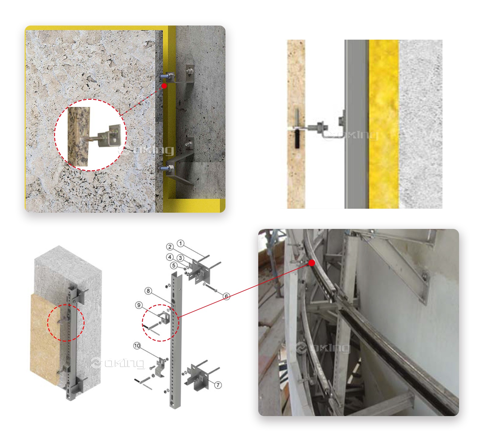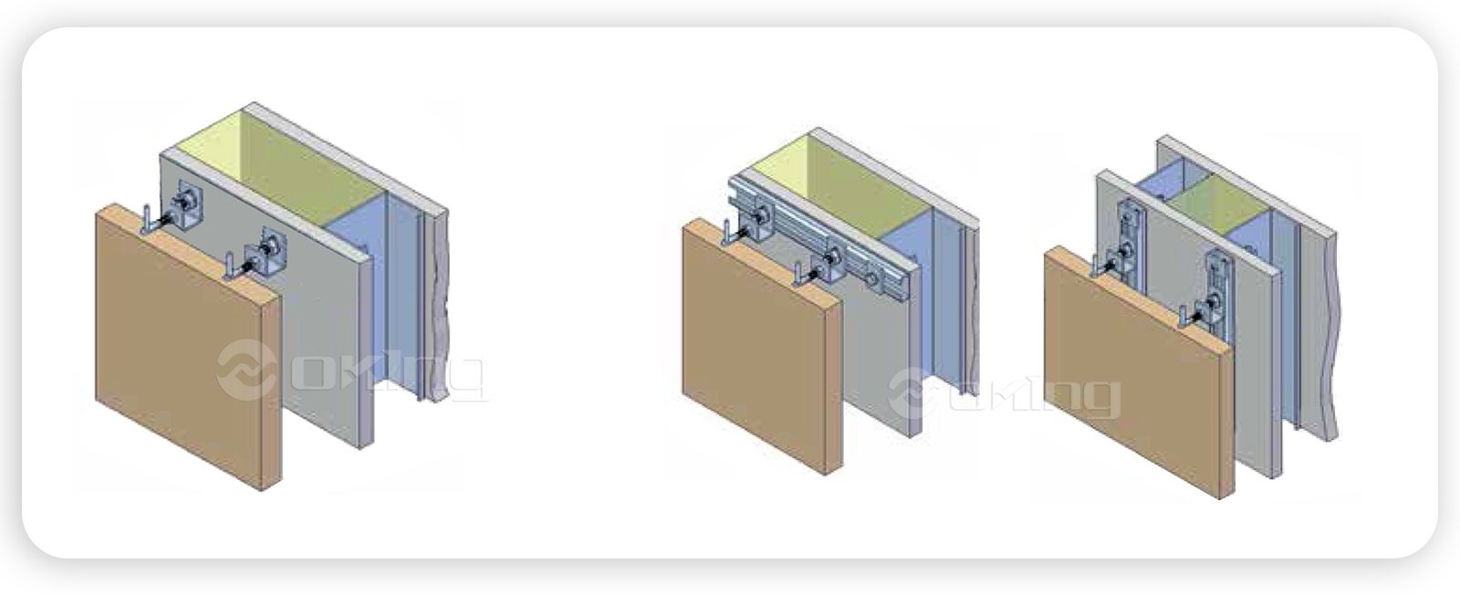 El proceso de instalación implica fijar los soportes verticales a la pared o estructura utilizando sujetadores adecuados, como tornillos o pernos. A continuación, se fijan los soportes horizontales, como por ejemplo un panel o un sistema de revestimiento, al objeto que se va a instalar. Los soportes horizontales están diseñados para entrelazarse con los soportes verticales, creando una conexión segura y confiable.